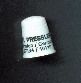 White plastic Advertising thimble with black printing. Advertising ÒC & W Pressler 7101 Ellhofen/Germany Tel 07134/10110Ó U.S.A. 13 in apex
