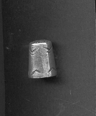 Silver hand crafted thimble. Side seamed. Simple line zigzag design atbase and top of thimble. Top has design of flowers as knurling. No marks.
