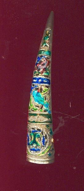 Oriental finger guard. Overlapping. Silver with coloured enamel design - blue, red, purple, green.