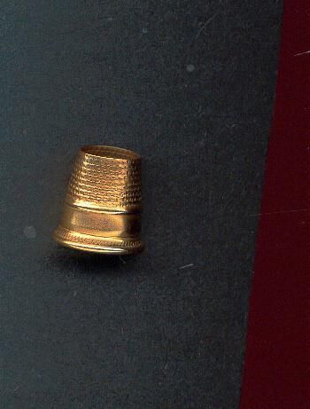 Brass tailorÕs thimble with rolled rim. Narrow band of slanted lines above rim then a wide plain band before knurling to open top. Size stamped on plain band.