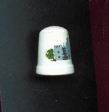 White unglazed hand painted pottery Souvenir thimble. Painted - grey mission building, green trees. On reverse written in black ÒMission San JoseÓ, (near San Antonio, TX). Rounded top with knurling.
