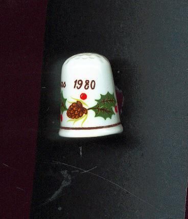 White bone china glazed Christmas thimble. Gold line near rim. Decal design on body of thimble of holly berries, leaves and pine cones. 1980 and Christmas in black above the picture. Inside in blue Queens Fine Bine China Made in England.