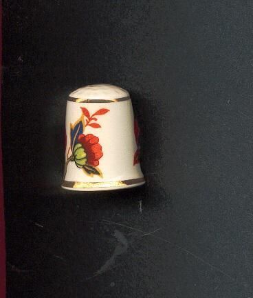 Cream coloured glazed ironstone china thimble. Gold band at top and rim. Decal design of sprig of leaf and flower, green and red leaves, deep red flower, green stem. 2 designs. Faint knurling on rounded top.Inside Crown with Masons above and Patent Ironstone Made in England below.