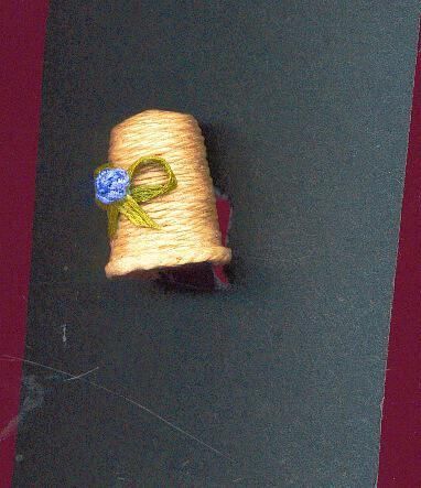 String thimble in beige colour. Added rim and a green bow with purple flower in center. Very formly put together.