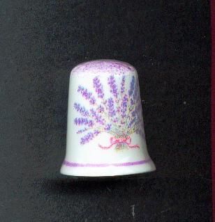 White glazed china Souvenir thimble with purple band at rim..2 bouquets of lavender tied with pink ribbon on front and reverse of thimble. Top covered with purple dots, rough but no indentations. Inside stamped in red ÒNorfolk Lavender Fine ChinaÓ.