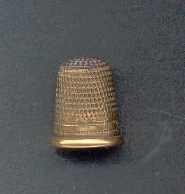 Brass thimble with Steel top. Rolled rim. Wide plain band above with indents above and below. Size marked between indent lines. Dent and out of round.