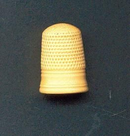 Early plastic imitation ivory thimble. Wide border of indented and raised bands Knurling to and over top. No marks.