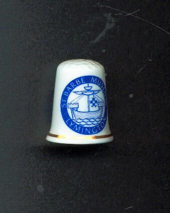 White bone china glazed thimble with gold line at rim. Blue and white design of a ship on water with ÒSt. Barbe Museum LymingtonÓ around the oval that the ship is in. Inside also in blue Fine English Bone China.