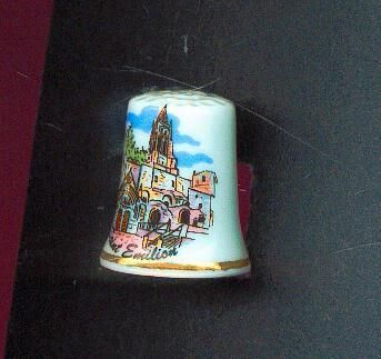 White glazed Souvenir thimble. Coloured decal of town buildings and church with Saint Emilion printed below. Fine gold band at rim. No marks.