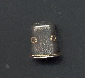 Silver and gold thimble, hand crafted. Side seamed. Extended silver rim has gold rope on it. 4 small gold rope circles around body of silver thimble. Hand knurling on relatively flat top. Inside signed Roca 18K Silver and 2000.