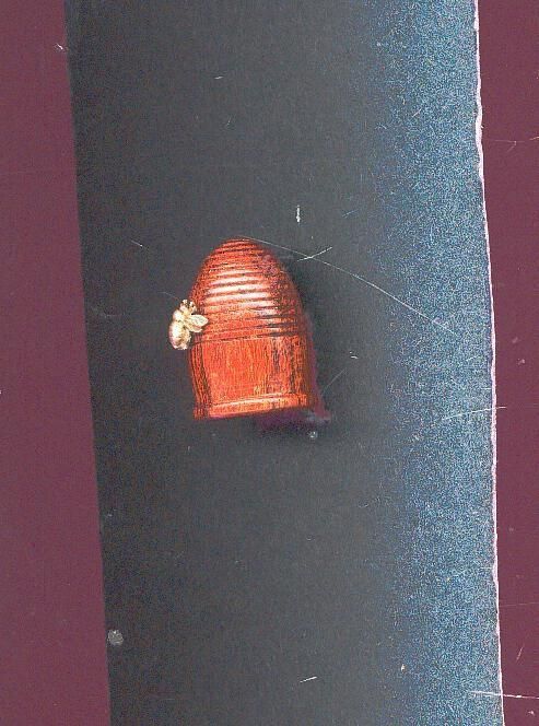 Carved wooden thimble in beehive shape . Deep brown wood. Wide plain band above raised rim. Horizontal grooves from band decreasing in size to pointed top. Brass bee on the grooves. No marks.