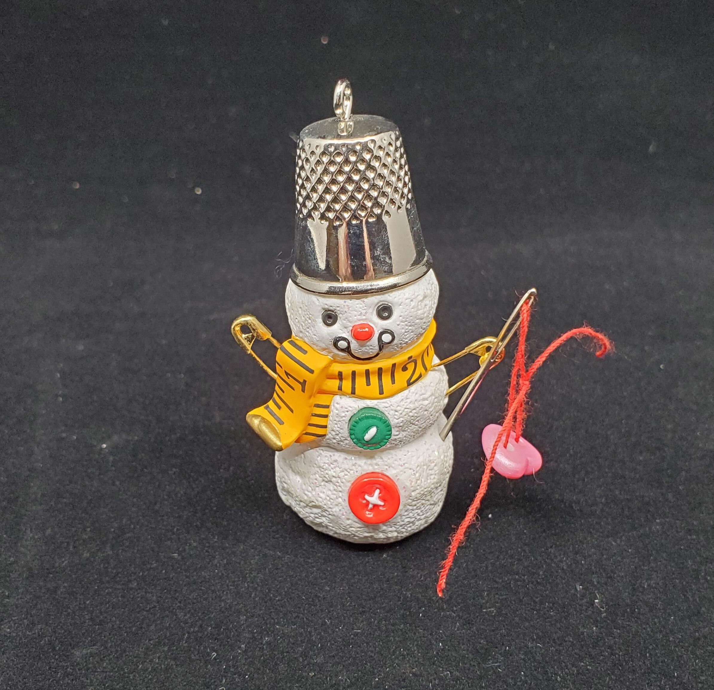 Hallmark 1999 Keepsake Orbament. Sculpted by Sue Tague. Snowmanm with tape measure around neck, thimble hat needle and pins, coloured buttons,mouth is part of hook and eye.