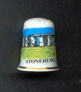 White glazed bone china Souvenir thimble. Decal of ÒStonehengeÓ coloured. Slightly fluted with gold band near rim. Knurled top. inside stamped English Heritage Fine Bone China.