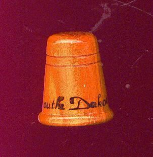 Wooden Souvenir thimble. Polished, rolled rim. Double indented lines near top of thimble. Flat top. South Dakota in black near rim. No knurling. No marks.