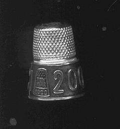 Millenium Commemorative thimble, silver, large. Wide band at rim with TCI (Thimble Collectors International) and 2000 in large letters on darkened background. Bouquet of flowers and a thimble are also on the band. Ribbon on flowers has a G and 925 on it. Thimble hasNew Year and 2000 on it. Knurling from band to top.Flat top with small caseÓ tci Ò and thimble on it.