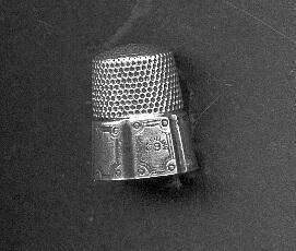 Silver panelled thimble. 6 panels with simple design around edge of each panel of lines and circles. Knurling from band to and over top. Inside Simon Bros. logo. Size stamped with the word Sterling on ome of the panels.