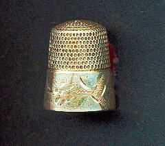 Silver thimble with wide engraved band. Bright cut design of flower with 7 petals and leaves. Cartouche marked by zigzag lines. and ÒGrandmaÓ between. Marked size and Sterling on band which takes up 1/2 the thimble. Knurling from band to and over top. Inside apex Simon Bros. logo.