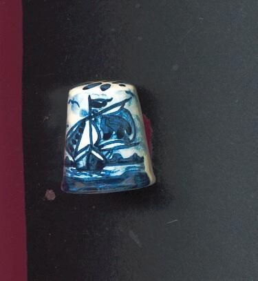 White hand painted pottery thimble. . Design in blue on body and top of thimble - scene of a sailing ship on water around body. 6 blue leaves on top Thimble smooth, no knurling. Inside signed ÒBy Cornelia VancouverÓ