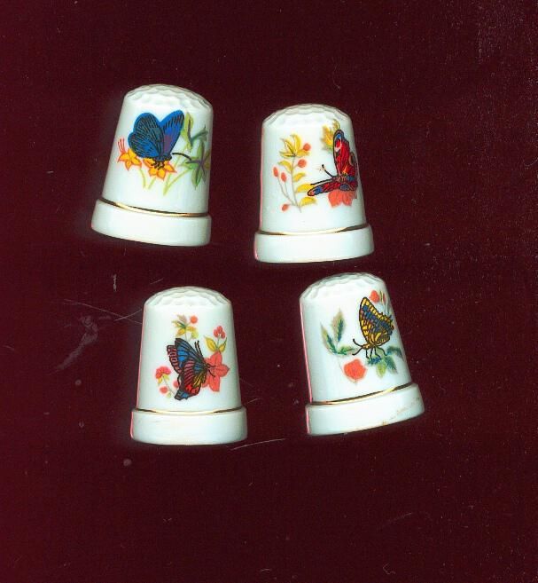 Set of 4 china butterfly thimbles. Decals of butterfly, flower, leaves on white thimble. Raised rim with gold line at top of rim. No marks.