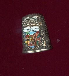 Souvernir thimble with rolled rim. Narrow plain band above rim with lined bands above and below. 17 (size) and Germany on band. Added crestr, coloured, of buildingas with ÒNew Orleans SquareÓ above. No makers mark.
