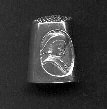 Silver thimble, Commemorative, of the 100th birthday of the Queen Mother. (England) Cur out picture on front.On reverse ÒHer Majesty Queen Elizabeth The Queen Mother 100 Years 1900-2000Ó Hllmarks below at rim Maker PL 925 Rose? Lion passant 8 (size) and year.