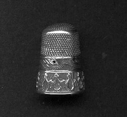 Silver thimble, tall with 2 holes. Wide band of pattern at rim - Narower band above of scrolls, then knurling to and over top. Cable Thimble No marks.