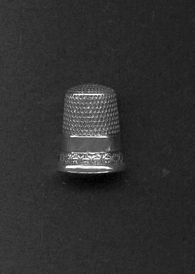 Silver thimble with raised rim. Narrow band of pattern - double HÕs around. Wider plain band above with Lois - upside down to usuaul way - and size stamped on. Inside top faint signs of Simon Bros. logo.