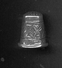 White glazed china souvenir thimble. Slightly rounded knurled top. Fine gold band near rim. Colourful scene of young people with banner reading ÒEspaniaÓ at bottom. No marks.