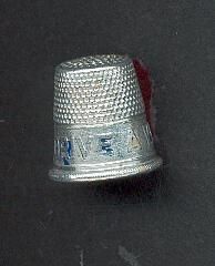 Plastic (or is it wood?) thimble - yellow band at rim. Mottled colours of flowers. leaves and stems in a pot - blue, green, red, black, all-over. Black interior.No knurling.