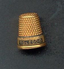 Old flattened metal thimble. 14-15th century shape and style -Plain at rim with rows of knurling up and over top .