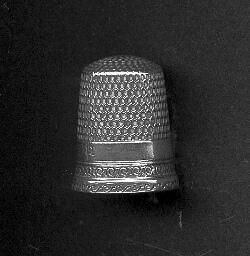 Gray metal thimble with 4 wheeled cart on topwith words ÒHersheyÕs CocoaÓ Decorated rim. wide plain band then knurling to top.