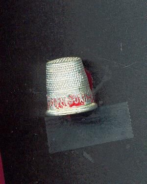 Whit china thimblw quth fluting ar rim. Fine gold line above fluting. On top of thimble, green grass purople flowers,and dog? rabbit? with huge ears. brown cream colours with blue ribbon at neck. Inside initials RG