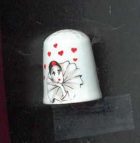 White glazed china thimble with decal decoration of theatrical lady - carnival mask - with hearts. Colours red, black and white. No marks.