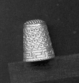 Silver thimble, side seamed with raised dot rim. Greek key pattern, right, above then 4 horizontal rows of touching raised circles to top, over a matte finish on whole of thimble. Separate top of square knurling. Very light weight silver. Inside not matte finish. No marks