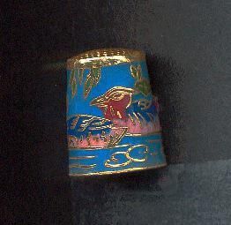 Blue enamelled thimble with all-over design of ducks, water lillies , pond in red, black blue with gold outlines. Side seamed. Knurling on separate gold top.