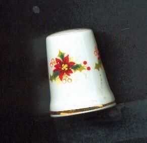 White, glazed, bone china thimble, slightly fluted at rim. Narrow gold band at rim. 3 sprays of poinsettia,holly and berries around body of thimble. Faint signs of knurling over flat top. Stamped inside ÒRoyal Albert Bone China EnglandÓ in black print and ÒPoinsiettiaÓ in red print.Decal.