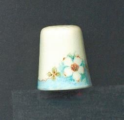 Pale blue pottery hand panted thimble.Design from rim with a deeper blue background with 2 whitw 5 petal flowers with green leaves. Flat top with knurling. Inside also pale blue and signed ÒMary AnnÓ