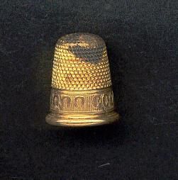 Brass thimble with rolled rim. Narrow band of pattern, vertically lined with wordsÓGood LuckÓ and 6 horseshoes. Knurling from band to and over top. Very yellow brass with bad stain over top.
