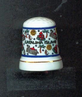 White china glazed Souvenir thimble with fine gold line defining slightly fluted rim. Decal design of coloured buildings, tree, sun, sailboats, with ÒCatalina IslandÓ through the middle. Gold paper label inside reads ÒMade in ChinaÓ.