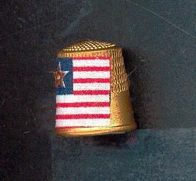 Patriotic Commemorative souvenir thimble. Plastic - gold coloured outside, cream colour insde. Outside has a cloth square flag added - state flag of Minnesots - red and white lines, blue corner square with silver star. Inside paper label with ÒLady Slipper Thimblers of Minnesota TCI Convention 2002Ó