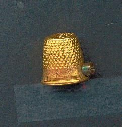 Brass thimble with needle pusher. Rolled rim with band of vertical lines above, then a wider plain band. A short metal pusher - 1/8Ó diameter and 1/8Ó long is on the plain band. Knurling friom band to and over top. Short squat type thimble.