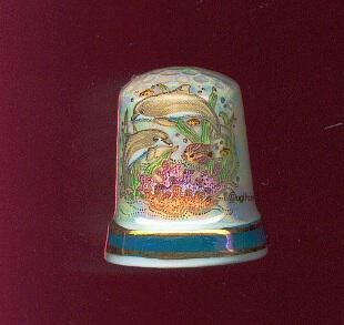 White glazed china Souvenir thimble. Raised blue rim with gold lines above and below . Over-all multi coloured background with water scene of dolphins and undersea fish and plants. ÒQuen MaryÓ vertically printed in gold. Rounded white top with knurling.