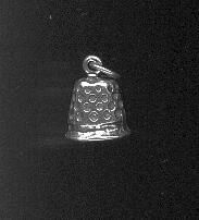 Silver thimble charm with ring on top. Side seamed with flared narrow rim. Oval shaped knurling to and over top. Top has attached ring with extra ring on it. No marks.