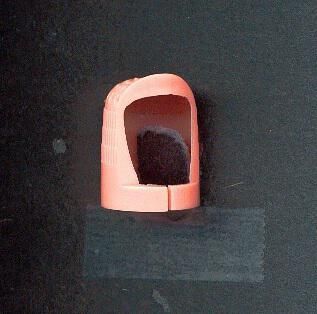 Pink plastic thimble with cut out. Top with round knurling and raised edge. Side - wide plain band then 3 rows of vertical lines to top. No Marks.