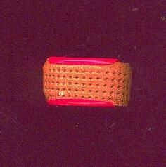 Leather, brown, ring type thimble. Joined at back with knotted thread. Red plastic back of knurling, shows at top and lower part.
