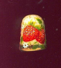 Hand painted thimble with gold band, uneven, at rim. Beige background, flecked. 2 strawberries, green leaves and white daisies. No marks