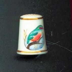 Hand painted bone china glazed thimble with gold lines at top and near rim. Slightly fluted thimble. White background with blue bird with red breast on bough one side, reed on other side with signature ÒS.Reb.Ó Inside Royal Worcester logo with Fine Bone China England in black print.