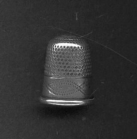Silver thimble with rolled rim.Wide plain band above with double scroll pattern with an ovasl eye in center. Cartouche with initials but badly worn. Also remainbs of other marks - an N. Knurling to and over top from band. Heavy. mNo marks inside.