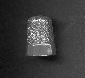 Tall silver thimble with wide panelled - 10 panels - band. Plain panels except one is stamped with size and Sterling. All-over vermicelli pattern from panels to and over top.Inside apex remains of Simon Bros. logo.