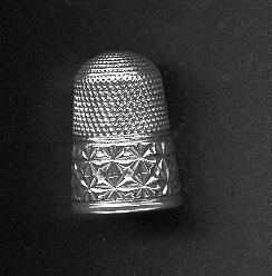 Tall silver thimble with dome top. Wide band of daisy pattern (1/2 thimble) at rim. Knurling from band to and over top. English hallmarks - Chester 1901 'A&S (maker Olney Amsden & Son) - on lower pattern band.